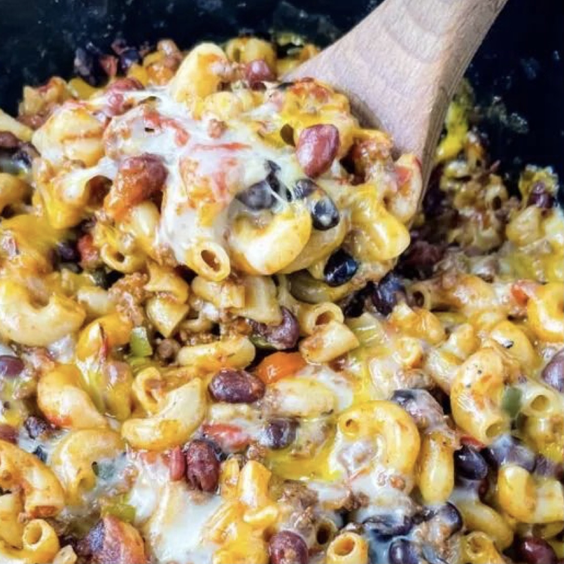 Ingredients: ground beef, onion, bell pepper, pasta, red kidney beans, black beans, spices, cheese and tomatoes.