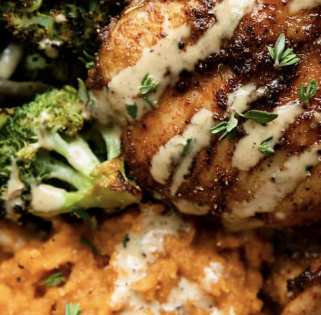 Ingredients: boneless skinless chicken thighs, broccoli, red onion, sweet potatoes, avocado mayo, mustard, honey, coconut aminos, coconut sugar, herbs and spices.