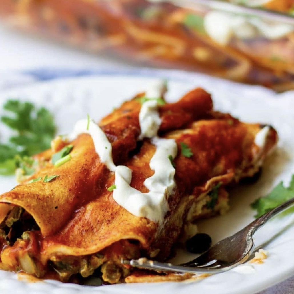 Ingredients: flour tortillas, chorizo, potatoes, peas, onion, cheese, tomato sauce, pinto beans, rice, and herbs and spices.