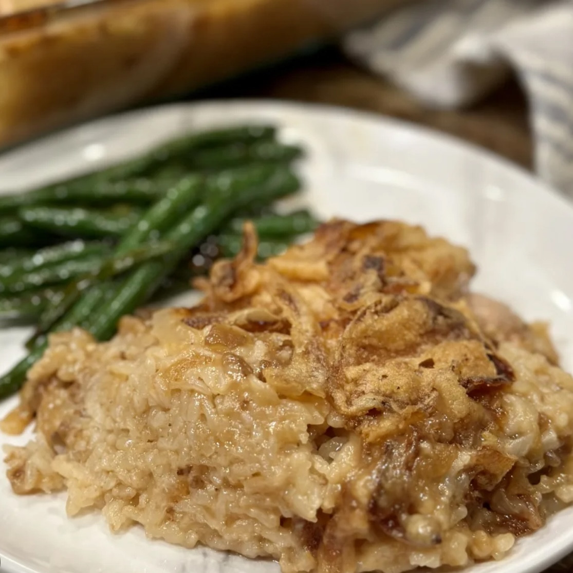 Ingredients: chicken breasts, rice, chicken broth, heavy cream, onions, balsamic vinegar, butter, garlic, thyme and other herbs and spices. green beans on the side