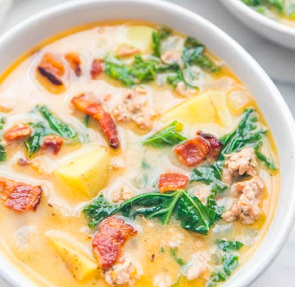 Ingredients: pork sausage, bacon, potatoes, kale, chicken broth, cream, spices.