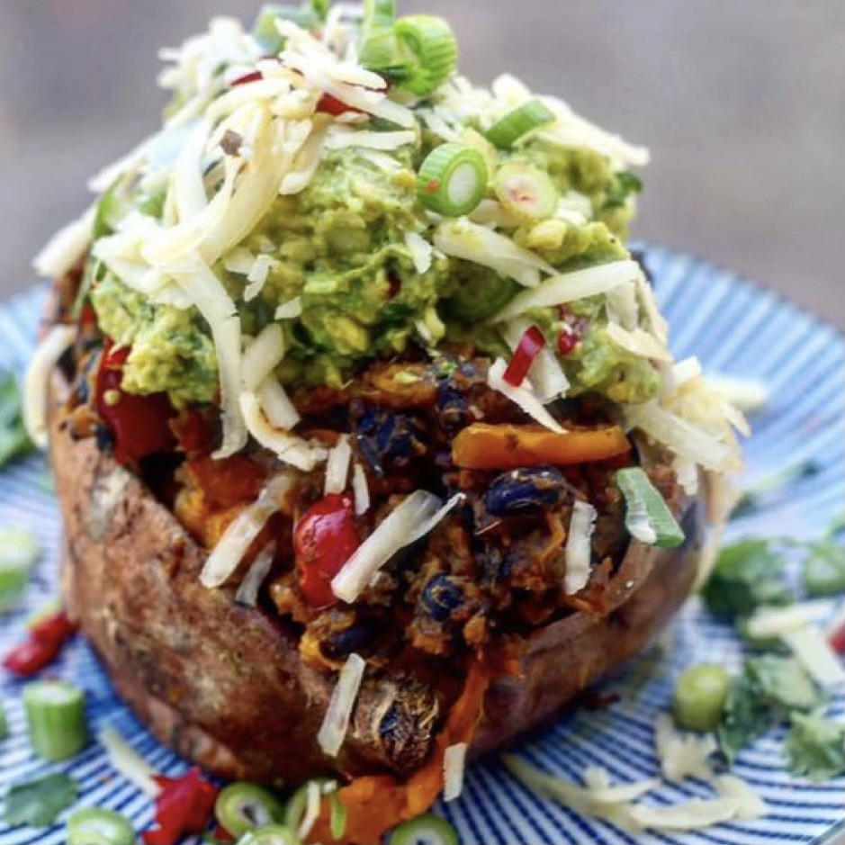 Ingredients: Sweet potatoes, black beans, red pepper, cheese, jalapeno, onion, Lobo's salsa, avocado, cilantro, lime and spices.