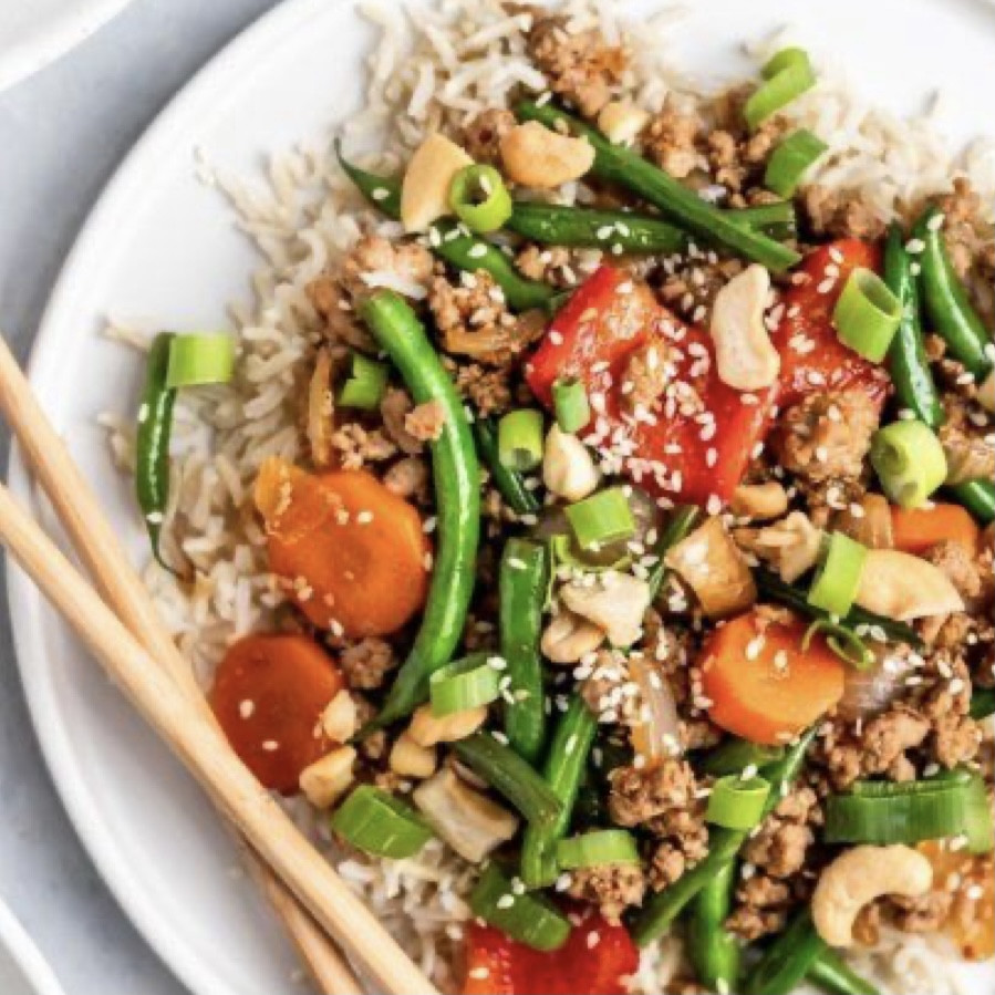 Ground chicken, bell peppers, white onion, carrots, green beans, coconut aminos, lemon grass, sesame seeds, cashews, arrowroot, white rice. Nutrition Facts Servings: 4 Amount per serving Calories 553 % Daily Value* Total Fat 20.2g 26% Saturated Fat 6.9g 35% Cholesterol 101mg 34% Sodium 125mg 5% Total Carbohydrate 52.2g 19% Dietary Fiber 3.8g 13% Total Sugars 5.4g Protein 40.1g Vitamin D 0mcg 0% Calcium 66mg 5% Iron 5mg 28% Potassium 669mg 14%