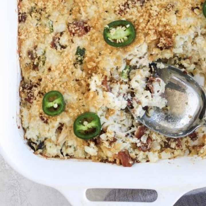 Ingredients: chicken, bacon, cauliflower, cream cheese, avocado mayo, spices and jalapeño