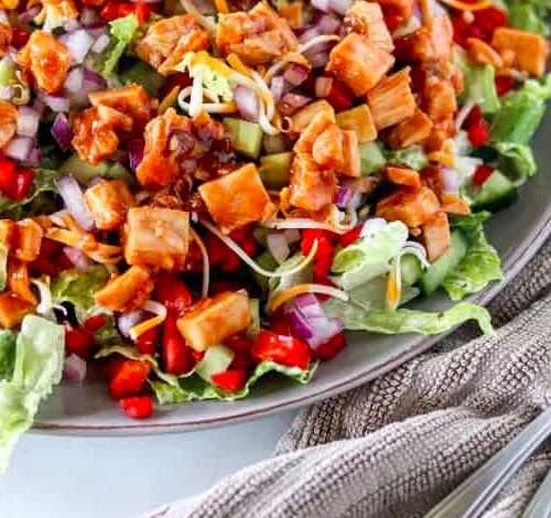 Ingredients: Chicken, romaine, cheese, red onion, cucumber, bell pepper, ranch dressing, hot sauce, coconut aminos, honey, coconut sugar, garlic, arrowroot, rice vinegar.