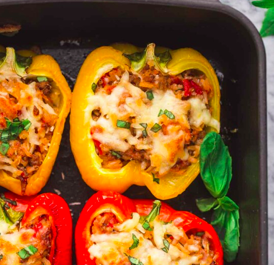 Ingredients: bell peppers, ground beef, tomatoes, cauliflower, sweet potatoes, black beans, mozzarella and spices.