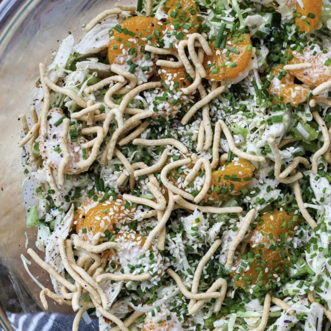 ingredients: chicken, cucumber, celery, shallot, cabbage, oranges, almonds, chow mein noodles, sesame seeds, greek yogurt, orange juice, honey, dijon mustard, coconut aminos, rice vinegar, salt