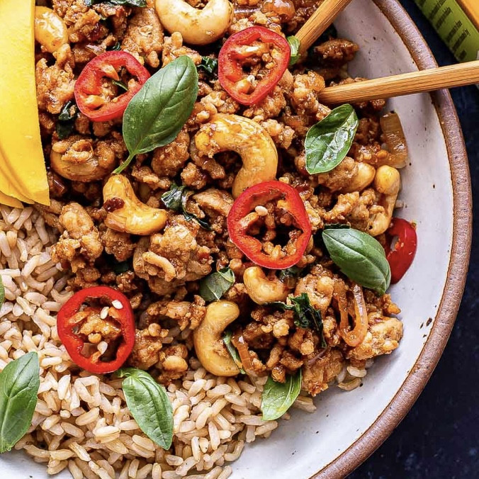 Ingredients: ground chicken, rice, bell pepper, onion, ginger, garlic, peanuts, coconut aminos, sesame oil, rice vinegar, salt and other spices.