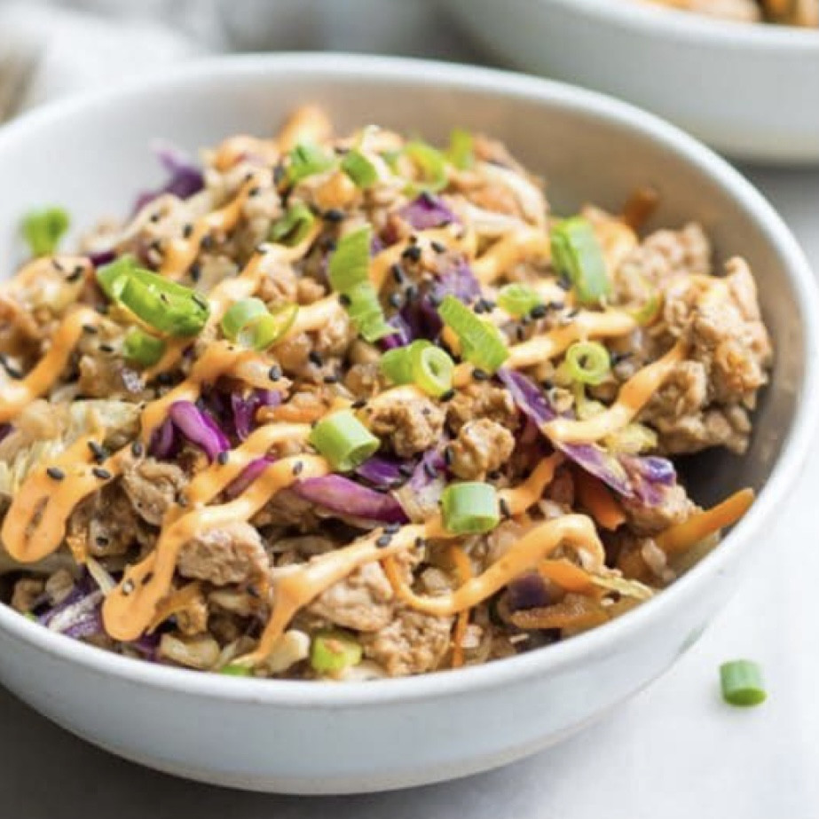 Ingredients: ground chicken, cabbage, carrots, water chestnuts, coconut aminos, ginger, sriracha, rice wine vinegar, homemade mayo (egg and olive oil), sesame oil, green onion and garlic.