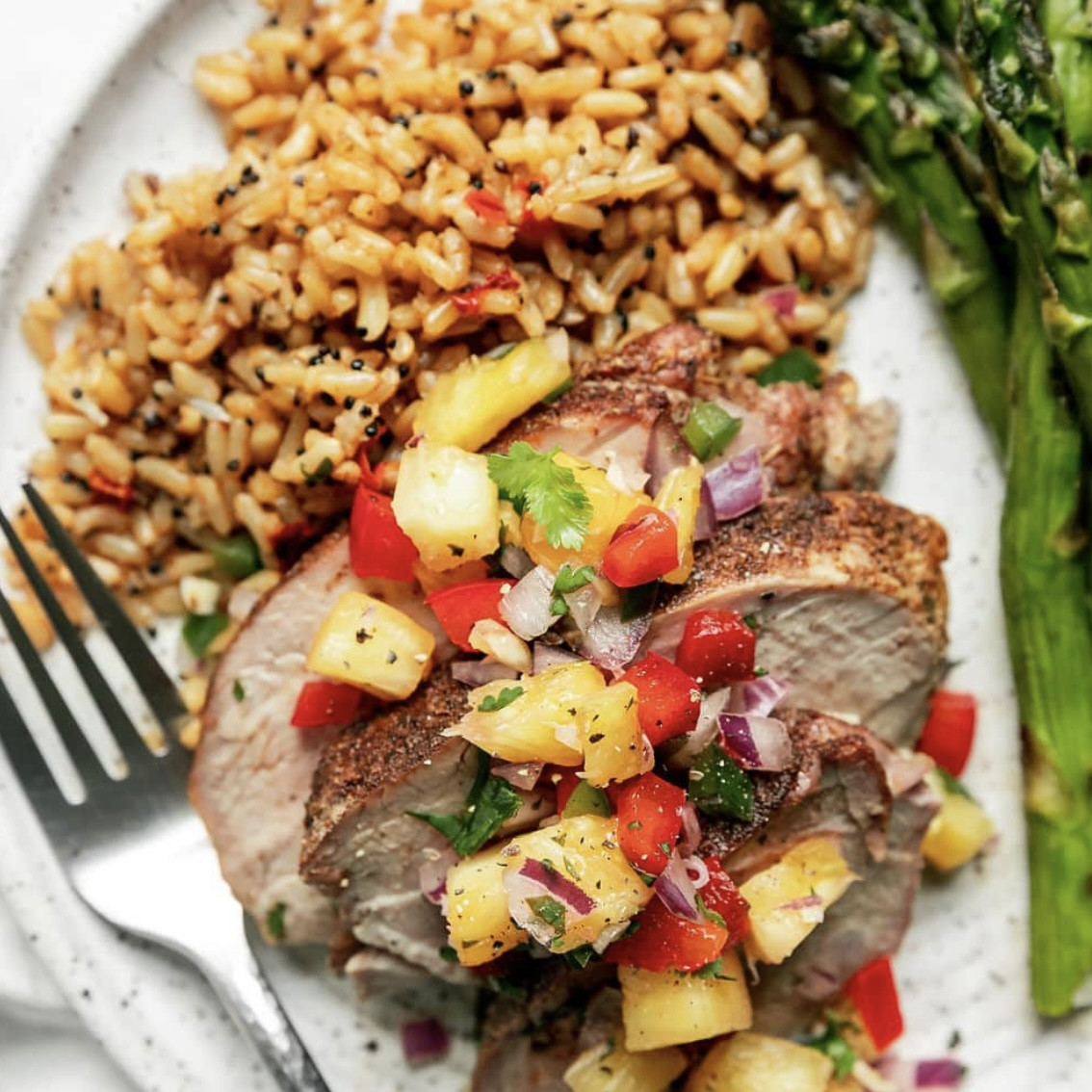 Ingredients: pork tenderloin, asparagus, rice, tomatoes, pineapples, red onion, cilantro, bell peppers, jalapeno, lime juice, garlic, herbs and spices.