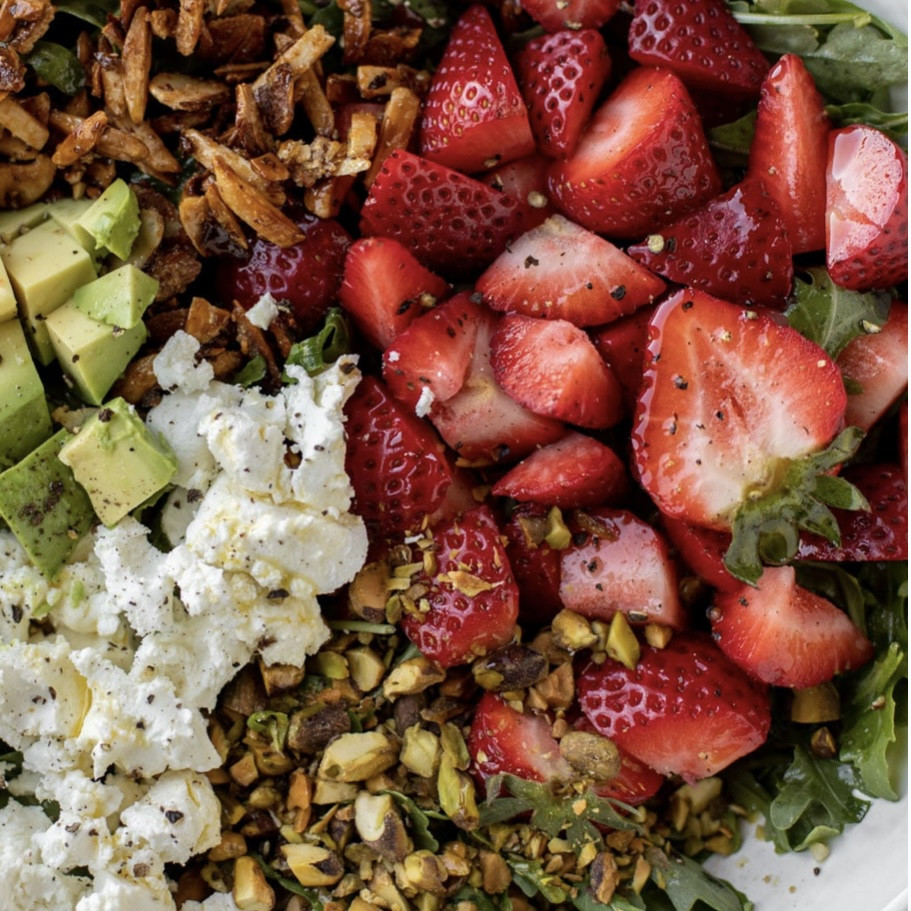 Ingredients: arugula/spinach, chicken, strawberries, goat cheese, pistachios, almonds, sugar, champagne vinegar, lemon, honey, dijon mustard, garlic, olive oil and salt.