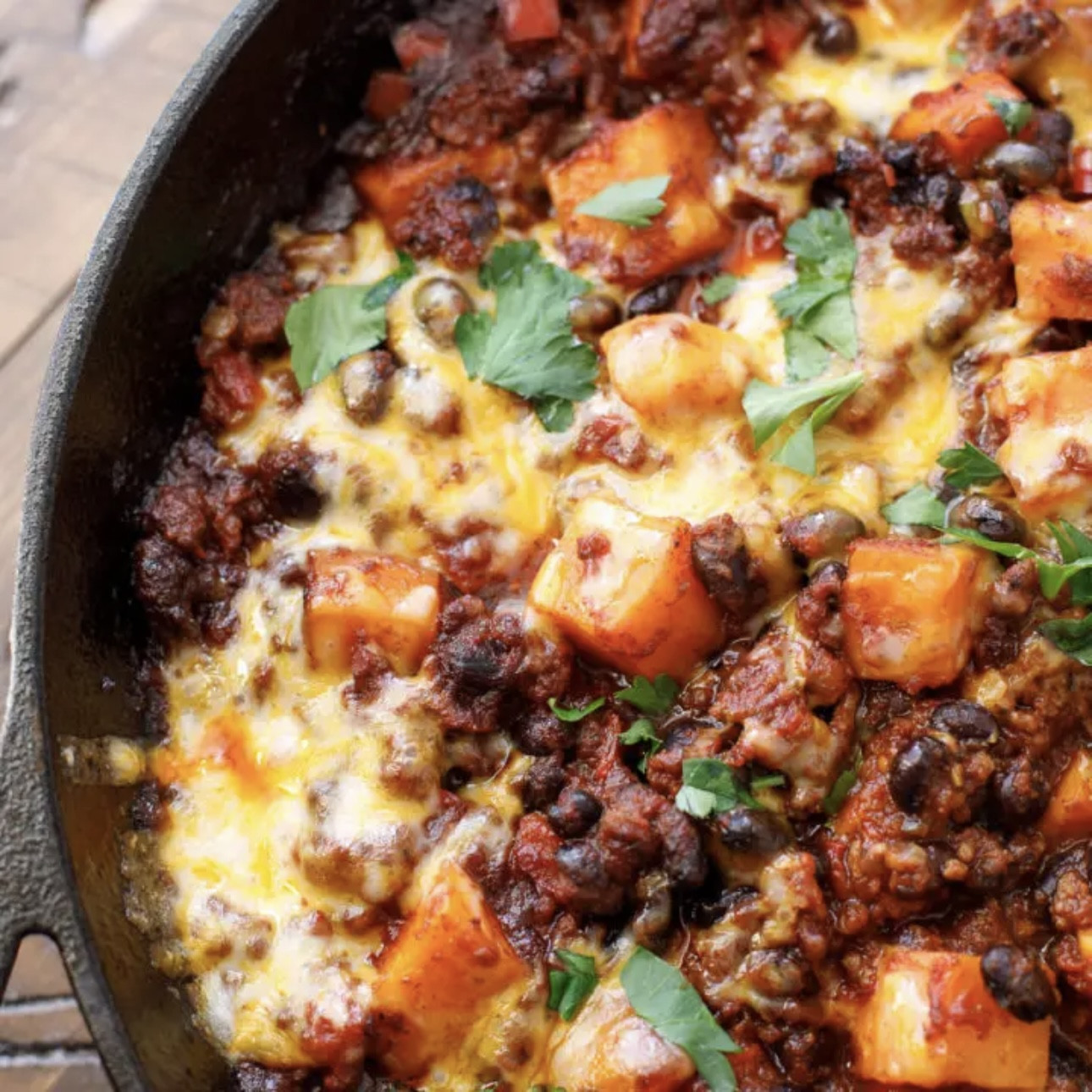 Ingredients: local grass fed ground beef, black beans, bell peppers, tomatoes, sweet potatoes, onion, garlic, monterey jack cheese, herbs and spices.