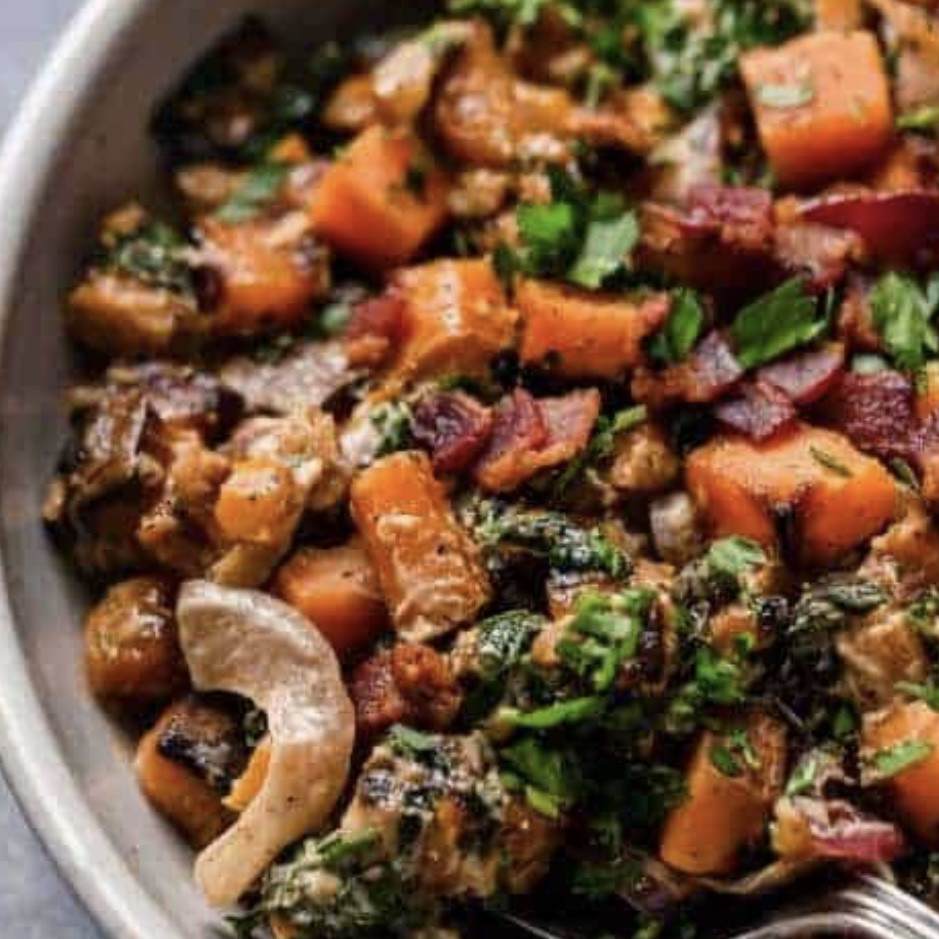 Ingredients: sweet potatoes, chicken breast, kale, bell pepper, onion, bacon, chipotle peppers, avocado mayo, garlic, lime, salt and pepper.