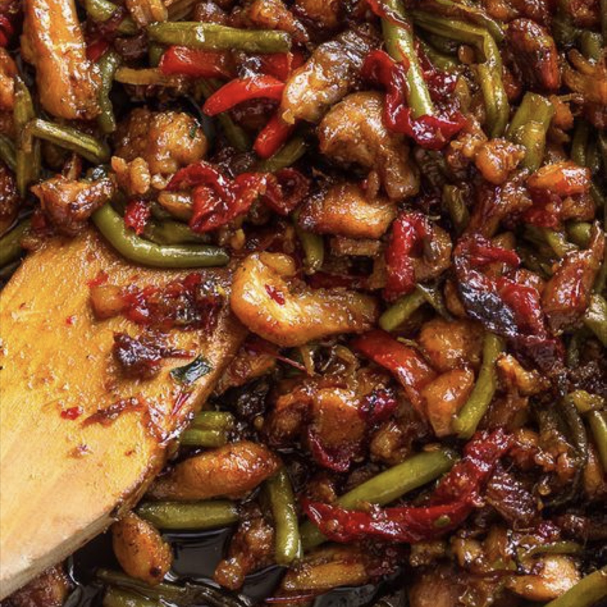 Ingredients: chicken, green beans, bell pepper, almonds, coconut aminos, sesame oil, honey, chili paste, rice and olive oil.